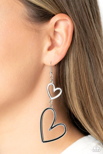 Dangling from an abstract silver heart frame, another heart frame, this time an oversized one, features a border of black paint, creating an attention-grabbing romantic statement below the ear. Earring attaches to a standard fishhook fitting.