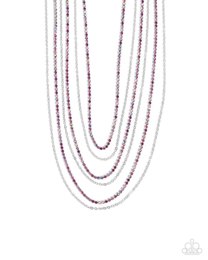 A cascade of shimmering silver chains alternates with rows of faceted fuchsia, light rose, iridescent, and rose rhinestones, creating a bold and dazzling layered effect. The reflective surfaces of the beads enhance the multi-strand design with a touch of brilliance. Features an adjustable clasp closure.