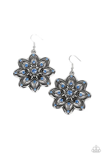 Dotted in Glacier Lake rhinestones, rows of smooth and studded silver petals bloom from a Glacier Lake rhinestone center for a whimsical floral fashion. Earring attaches to a standard fishhook fitting.