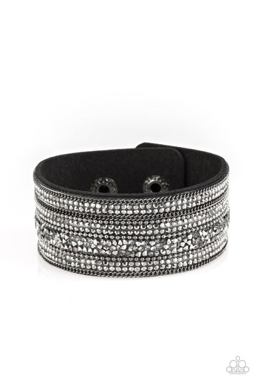 Rows of shimmery gunmetal chains, glittery hematite rhinestones, and metallic prism rhinestones are sprinkled along a thick black suede band for a sassy style. Features an adjustable snap closure.