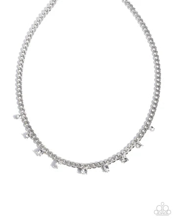 Set in pronged silver fittings, a white gem collection in dainty round, upside-down teardrop, and classic round cuts dance from a thick silver curb chain, creating a delicate collision of refinement and grit as they lay along the collar. Features an adjustable clasp closure.