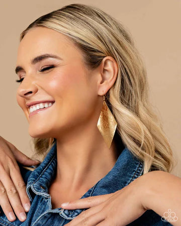 Etched in shimmer, a kite-shaped gold frame delicately folds and ripples as it falls from the ear for an edgy vibe. Earring attaches to a standard fishhook fitting.
