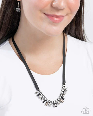 Black ribbons give way to an antiqued silver chain embellished with a collection of oversized emerald-cut and round rhinestones in shades of white, hematite, and black. The geometric and vibrant design creates an edgy and bold statement. Features a ribbon-tie closure for adjustable length.
