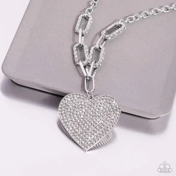 Elongated, oversized silver links, encrusted with a blinding display of white rhinestones and shimmery silver accents, connect a classic silver chain to an exaggerated silver heart pendant for a romantically refined finish. Featured on the oversized silver heart, layers upon layers of glitzy white rhinestones emboss across its entire surface as the hearts gradually increase in size from the center. Features an adjustable clasp closure.