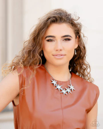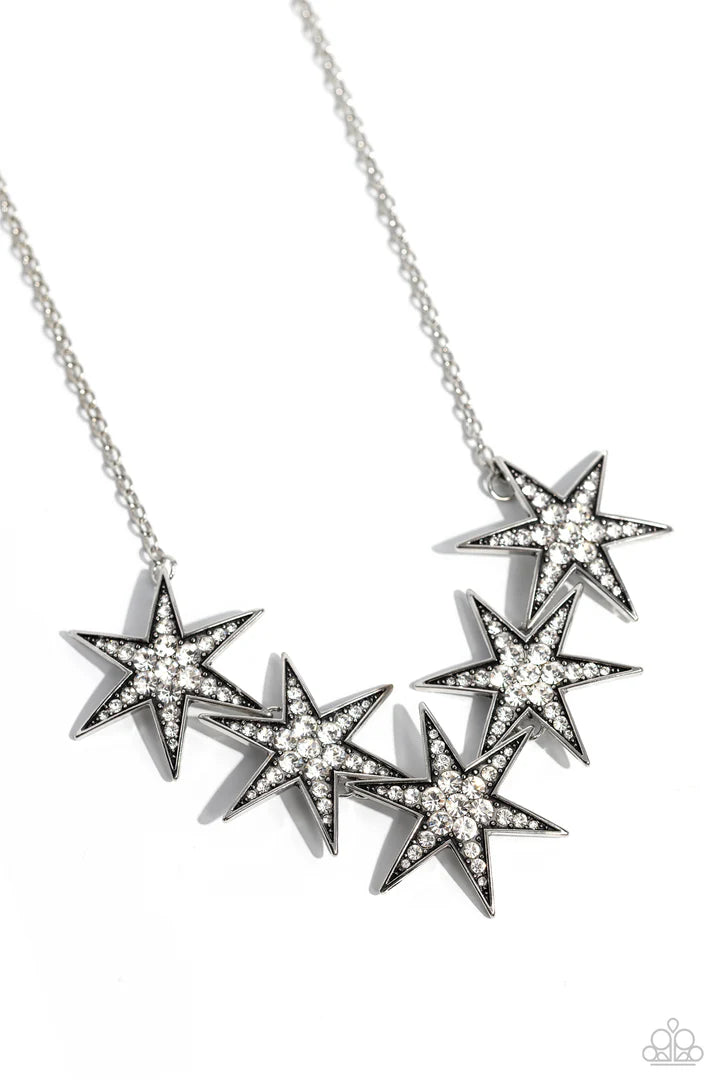 Dotted with various sizes of highly reflective white rhinestones, a stellar collection of 3D silver stars interlock from a dainty silver link chain for an out-of-this-world edgy fashion. Features an adjustable clasp closure.
