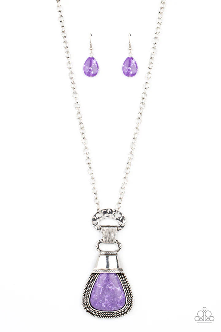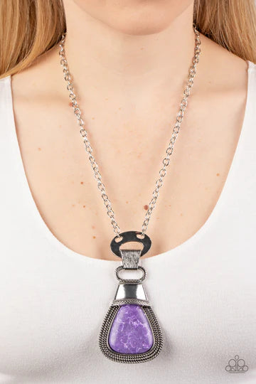 An oversized purple stone is encased in a silver frame made up of layers of rope-like texture and topped with an antiqued silver adornment stamped in rustic patterns. The vivacious pendant swings from a hammered silver ring and clasp at the bottom of a lengthened silver chain, resulting in a captivating finish. Features an adjustable clasp closure.