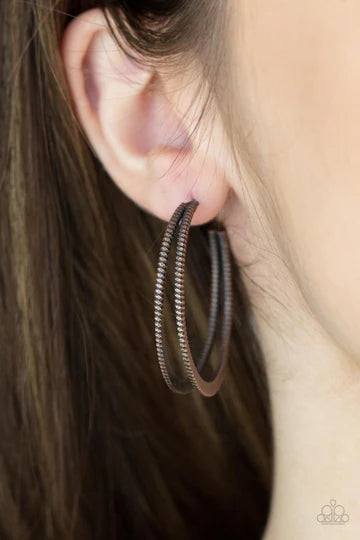 Featuring textured edges, two copper crescent frames delicately curve into a bold double hoop for an edgy urban look. Earring attaches to a standard post fitting. Hoop measures approximately 1 1/2" in diameter.