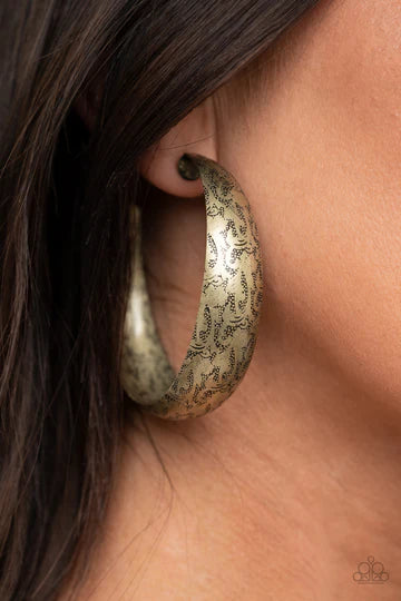 Delicately hammered in studded-like patterns, an oversized antiqued brass hoop boldly curls around the ear for a whimsically rustic look. Earring attaches to a standard post fitting. Hoop measures approximately 2" in diameter.