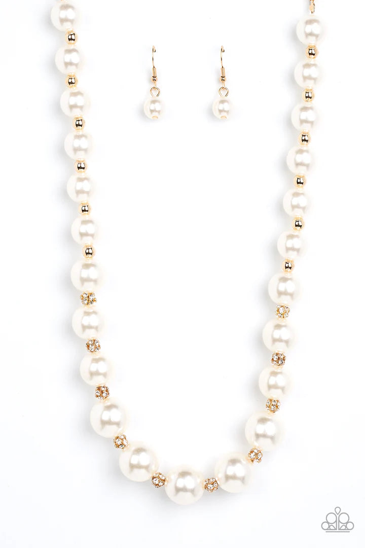 Gradually increasing in size, bubbly white pearls alternate with glistening gold beads and white rhinestone encrusted accents below the collar for a timeless finish. Features an adjustable clasp closure.