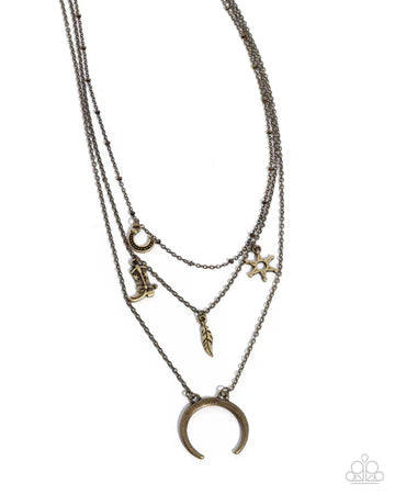 Gliding along layers of dainty and satellite brass chains, a collection of Western-inspired brass charms including a studded horseshoe, Sheriff's star, feather, detailed cowboy boot, and crescent horn create a cowboy chic cascade below the neckline. Features an adjustable clasp closure.