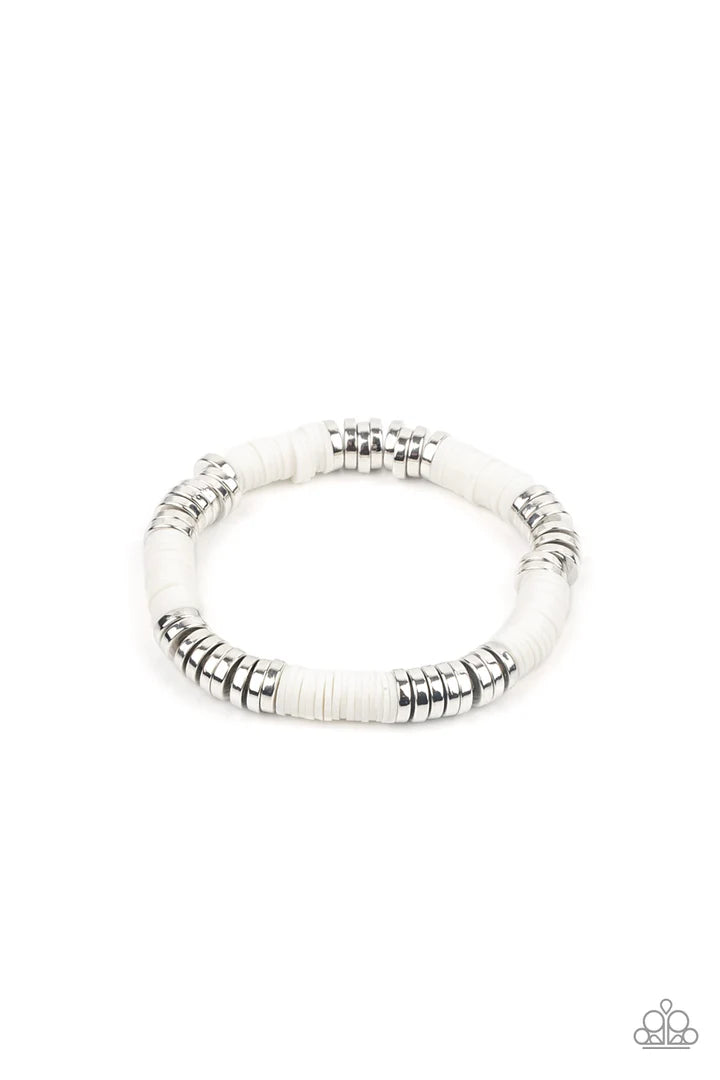 Stacks of rubbery white discs and bold silver rings are threaded along a stretchy band around the wrist, creating a versatile pop of color.