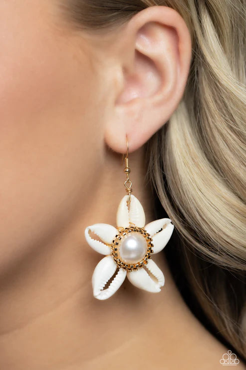 White cowrie shells surf out around an oversized white pearl center encased in a gold-pronged frame for a beach-inspired floral centerpiece. Earring attaches to a standard fishhook fitting.