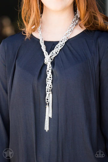 A single strand of spiraling, interlocking links with light-catching texture is anchored by two tassels of chain that add dramatic length to the piece. Undeniably the most versatile piece in Paparazzi's history, the scarf necklace features FIVE different ways to accessorize: Open Layer, Loop, Traditional Wrap, Double Knot, and Nautical Knot.