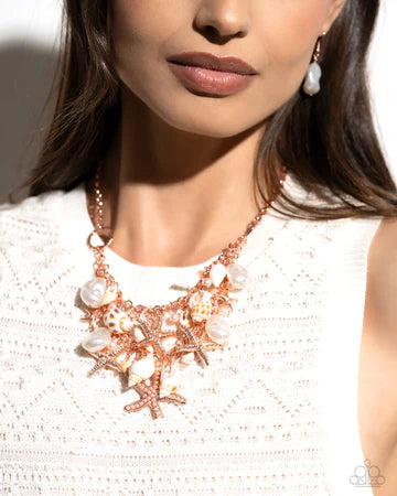 An eclectic display of shimmery shiny copper texture and beach-inspired accents gathers along thick, shiny copper links, creating a boisterous display along the wrist. The hodgepodge of texture and sheen includes textured shiny copper starfish, baroque white pearls, white seashells, dainty white pearls, and a dainty white pearl-encrusted shiny copper starfish. Features an adjustable clasp closure.