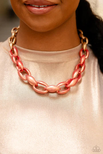 Burnt Sienna and Doe concaved hoops gradually increase in size as they elongate towards the middle of the neckline for a colorful combination. Features an adjustable clasp closure.