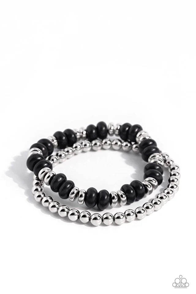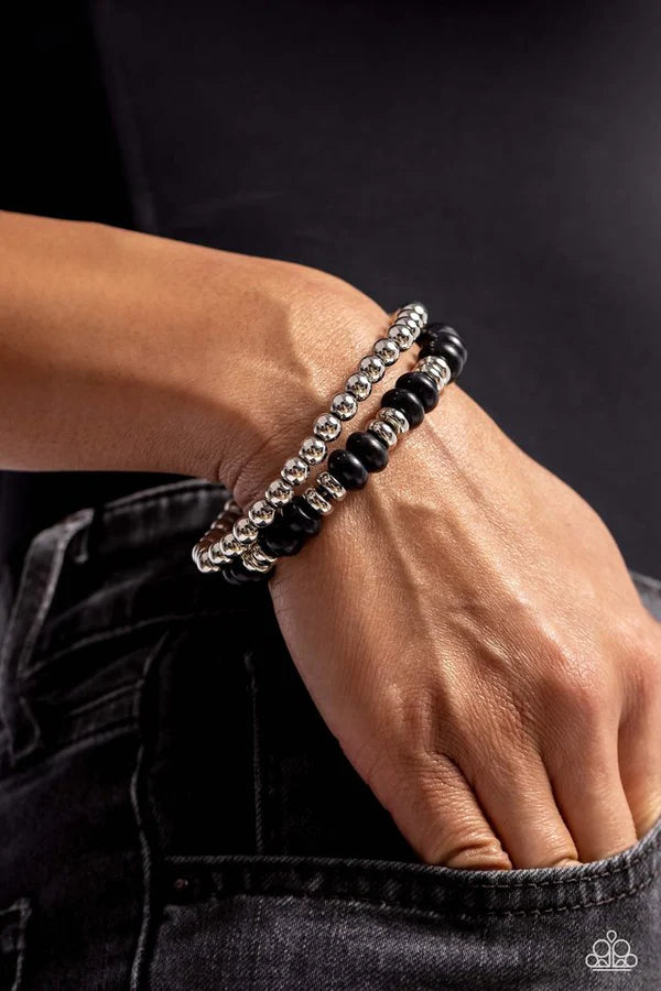 A neutral assortment of black stone beads, silver accents, and classic silver beads are threaded along stretchy bands around the wrist, creating an earthy pair.
