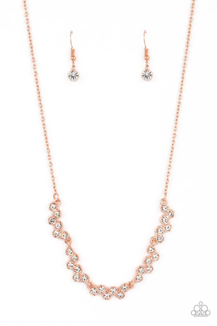 Dotted with glassy white rhinestones, dainty clusters of shiny copper heart frames delicately connect below the collar for a timeless twinkle. Features an adjustable clasp closure.