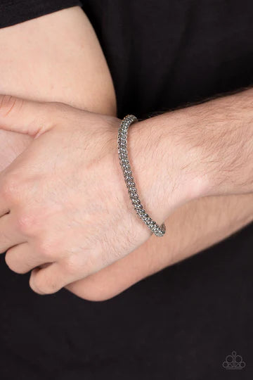 Featuring round links, a silver chain is threaded along a stretchy band around the wrist for a classic urban look.