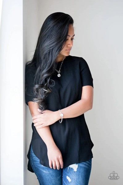 A dramatic gem white swings from the bottom of a shiny silver chain, creating a blinding pendant below the collar. Features a toggle closure.