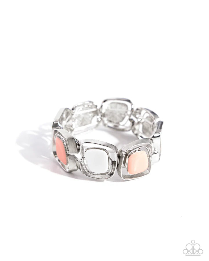 Pressed in airy abstract silver square frames, Desert Flower-painted acrylics alternate with abstract white shells along the wrist on an elastic stretchy band for a coastal centerpiece.