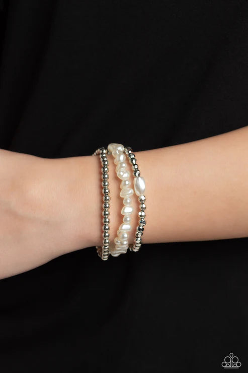 Coalescing into a light-reflecting stack up the wrist, silver beads, baroque white pearl beads, and faceted silver beads with a solitaire white pearl bead wrap around the wrist on elastic stretchy bands for a fashionable display.