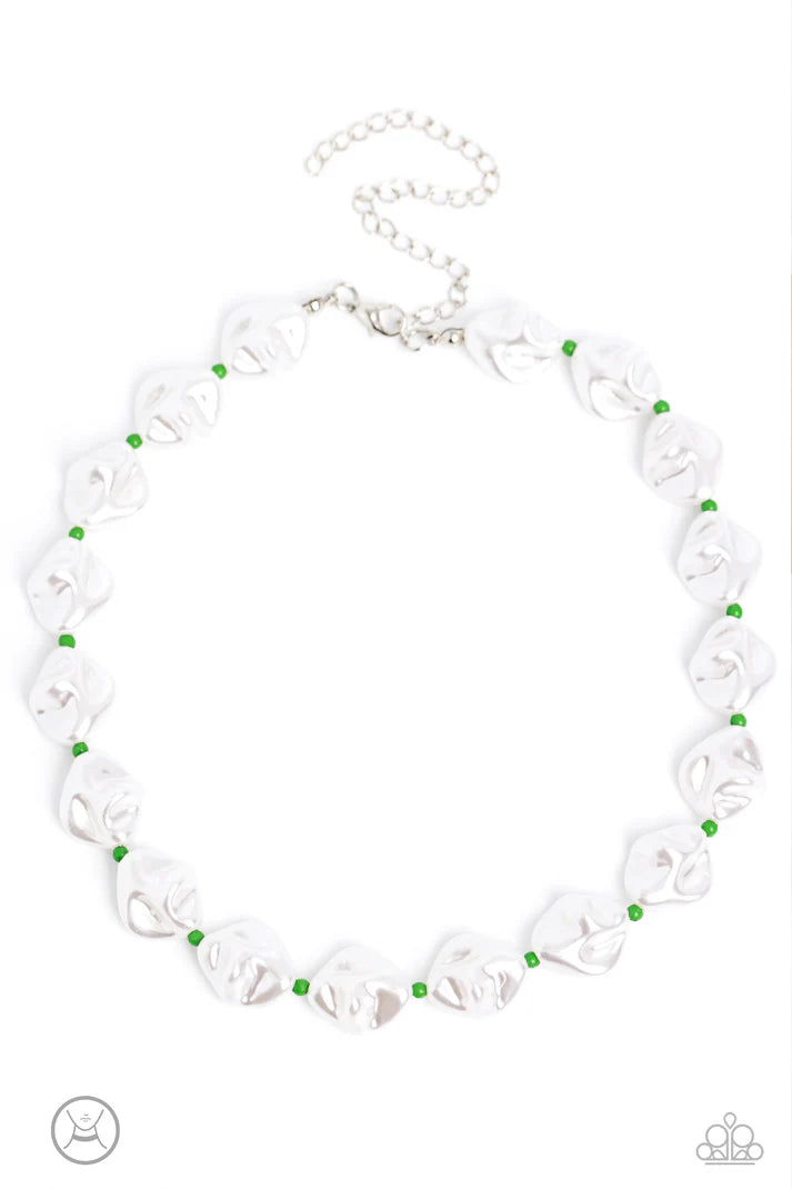 Rippling in texture, baroque white pearls alternate with classic green seed beads around the collar for a beachy statement. Features an adjustable clasp closure.