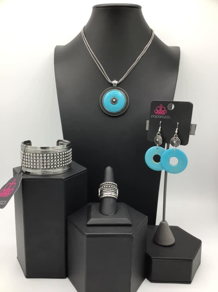 EPICENTER of Attention Blue Necklace: Double strands of silver box chain deftly carry a round turquoise stone set inside an antiqued silver frame. The frame, highlighted with raised dots in concentric circles, repeats inside the center of the turquoise pendant in a mesmerizing finish. Features an adjustable clasp closure.