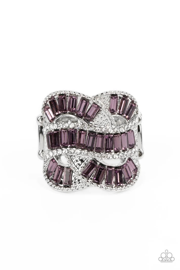 Rich purple rhinestones, chiseled into dramatic emerald-cuts, fall in line along twisting bands of silver. Tiny white rhinestones border the top and bottom edges of the swirling silver bands, emphasizing the shimmer as they interlock across the top of the finger. Features a stretchy band for a flexible fit.