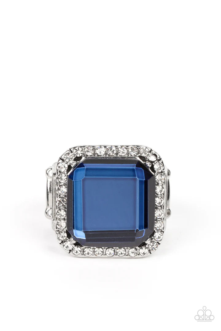 A lavish square Skydiver gem, encased in a border of dainty white rhinestones, makes a head-turning centerpiece as it gleams with an industrial edge atop the finger. Features a stretchy band for a flexible fit.