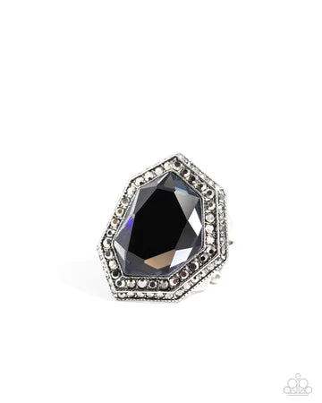 An oversized, asymmetrical, smoky gem smolders inside an asymmetrical, dual frame encrusted with dainty hematite rhinestones. The resulting sparkle combines into a jaw-dropping, exaggerated centerpiece atop the finger. Features a stretchy band for a flexible fit.