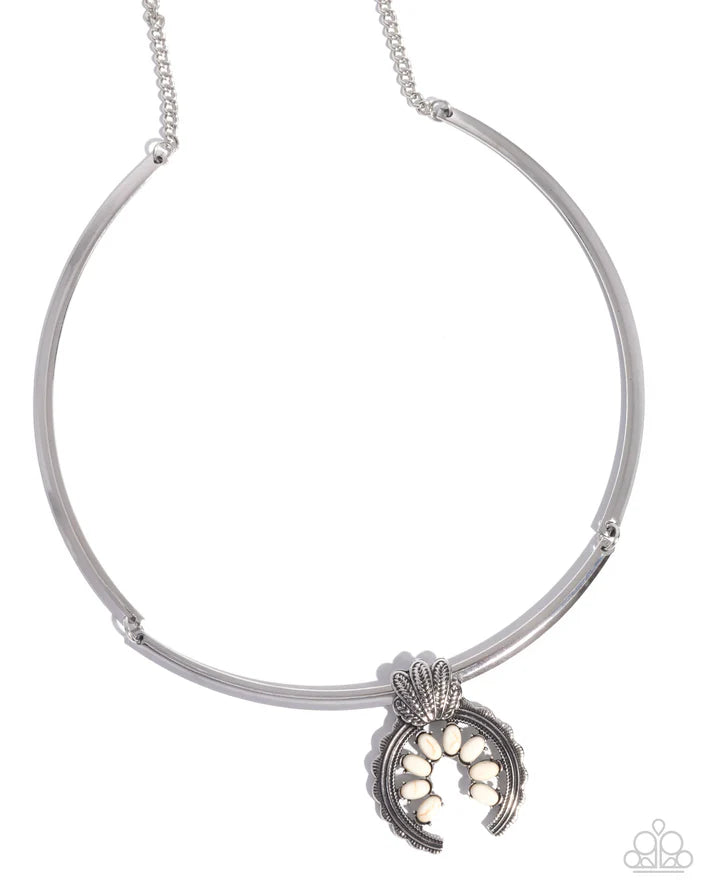 Sleek silver curved bars line the neck for a dainty sophisticated design. Centered along the lowermost bar, an upside down horseshoe pendant is lined with dainty white stones. Features an adjustable clasp closure. As the stone elements in this piece are natural, some color variation is normal.