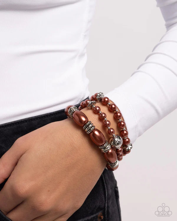 Glossy pearly brown beads, accented with silver floral-inspired beads, layer together around the wrist for a polished and refined look.