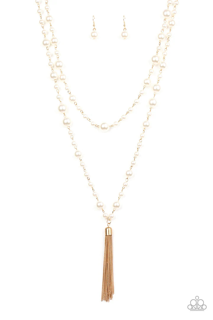 A collection of bubbly white pearls link into two strands down the chest. A shimmery gold tassel swings from the lowermost strand, adding a timeless twist to the classic pearl palette. Features an adjustable clasp closure.