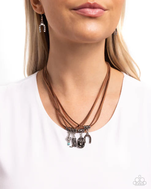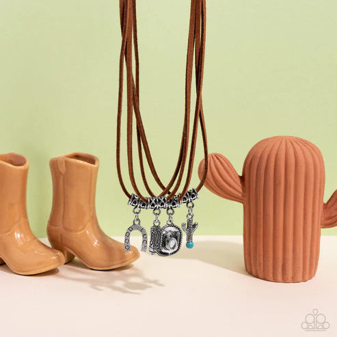 Infused along multiple brown suede strands, a collection of silver Western-inspired charms, including a cowboy hat, cowboy boot, horseshoe, and turquoise-dotted cactus swing below the collar. Features an adjustable clasp closure. As the stone elements in this piece are natural, some color variation is normal.