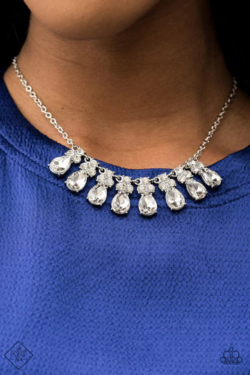 Crowned with trios of glassy white rhinestones, sparkly white teardrops link below the collar, creating a dramatically dazzling fringe. Features an adjustable clasp closure.