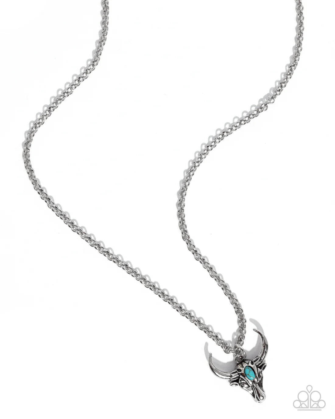 Embellished with an oval turquoise stone, a silver longhorn skull pendant glides along a classic, silver cable chain for a whimsically Western look. Features an adjustable clasp closure. As the stone elements in this piece are natural, some color variation is normal.