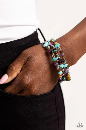 Featuring a chiseled finish, a mismatched collection of tiger's eye, turquoise, and amethyst stones and shiny silver beads are threaded along a coiled wire, creating an earthy infinity wrap style bracelet. As the stone elements in this piece are natural, some color variation is normal.
