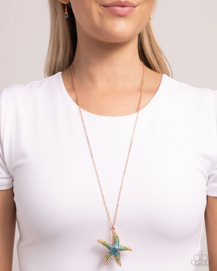 Embellished with various blue rhinestones that ombré out from the center of a shiny copper starfish pendant to green and yellow rhinestones glides along a shiny copper chain for a colorfully, coastal display. Features an adjustable clasp closure.