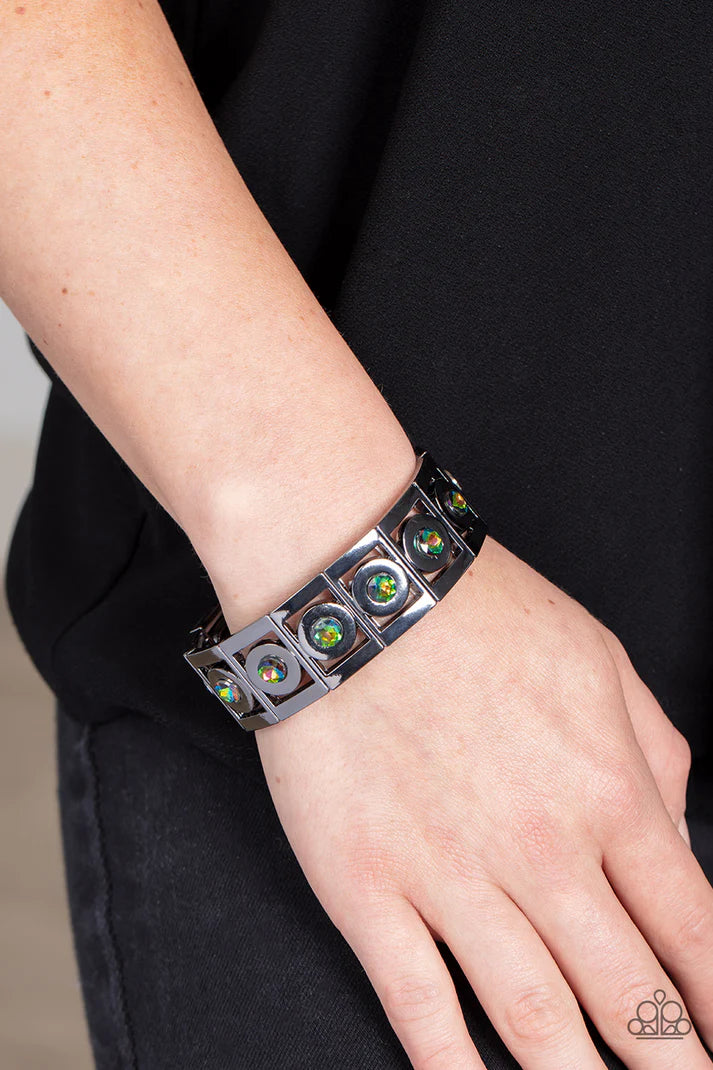 Vibrant oil spill rhinestones are encased in thick, circular gunmetal borders and nestled inside rectangular frames with the same metallic sheen. The frames are threaded along stretchy elastic bands, wrapping around the wrist in a dramatically refined finish. Due to its prismatic palette, color may vary.