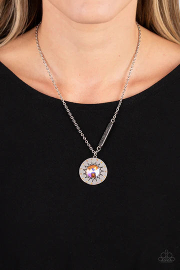 Hanging from the bottom of a classic silver chain, a silver pendant, with a lightly hammered sheen rests. Stamped on the pendant, a sun outlines the center with dainty orange rhinestones outlining the shape. Brightly gleaming in the middle of the sun shape, an oversized, faceted orange gem glistens, catching light on its surface. A hammered rectangular plate glides up the silver chain with the phrase "be the light" stamped in a script font, further anchoring the light-hearted motif of the pendant. Features an adjustable clasp closure.