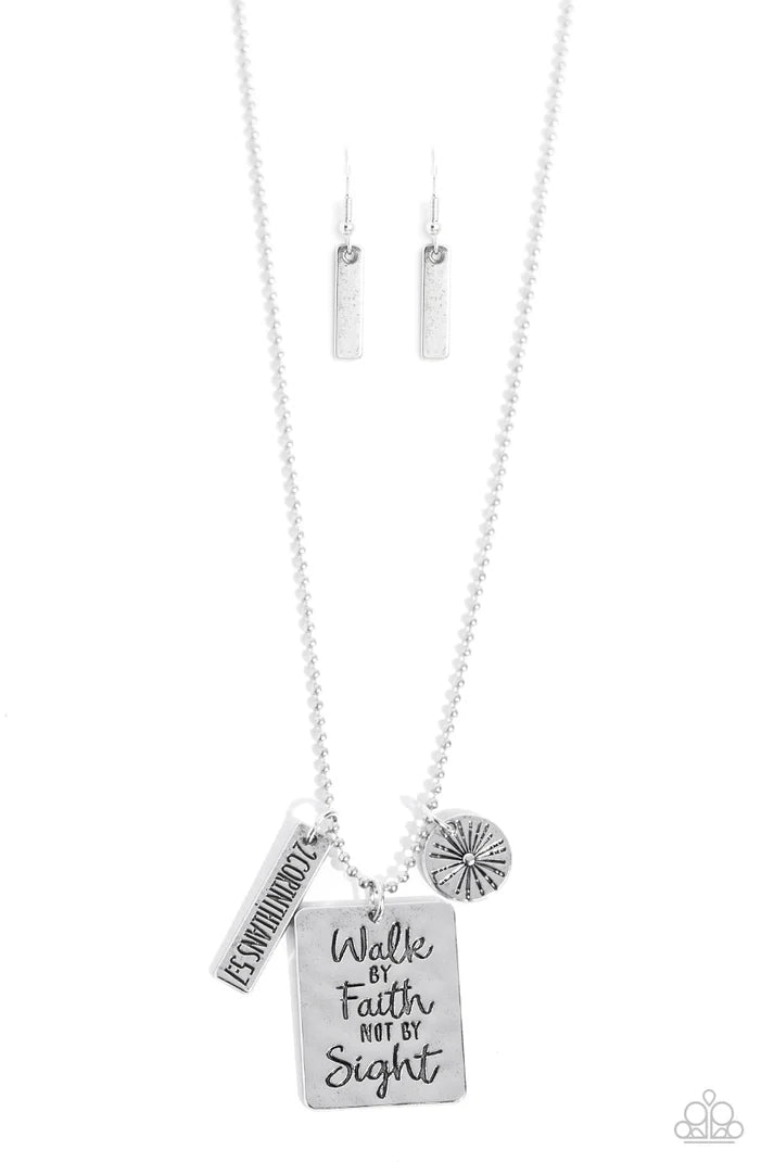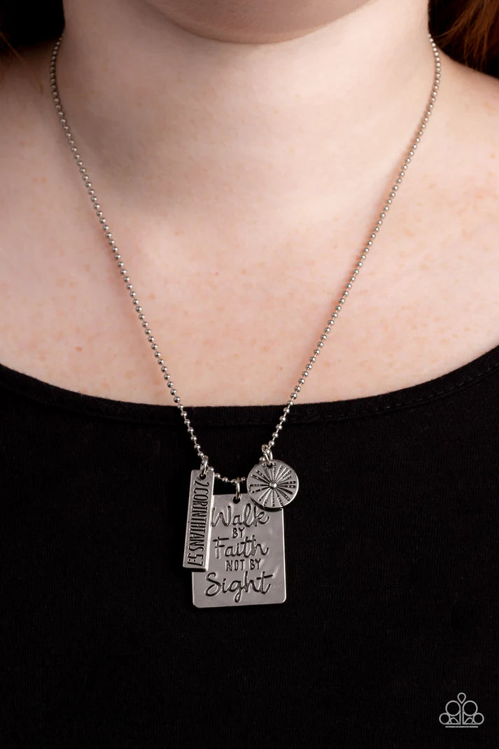Hanging from a silver ball chain, a hammered collection of a rectangular plate dangles next to a disc featuring a sun, and a bar stamped with the Bible reference "2 Corinthians 5:7". The three dangling silver shapes add eye-catching movement to the inspired design. Prominently stamped on the rectangular pendant, the words "Walk by Faith not by Sight" stand out for a faith-filled finish. Features an adjustable clasp closure.