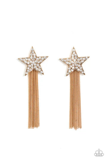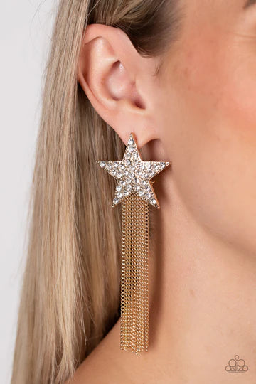 A curtain of gold chains streams out from the bottom of an oversized gold star encrusted in blinding white rhinestones, resulting in a stellar tassel. Earring attaches to a standard post fitting.