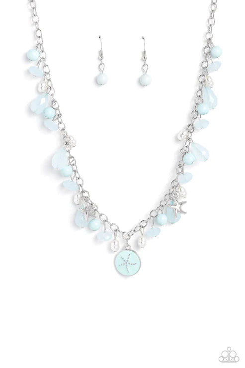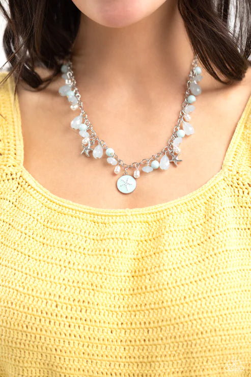 Glassy Skylight beads in various shapes, opaque Skylight beads, dainty baroque pearls, and silver starfish charms elegantly drip along a classic silver chain across the chest. A textured silver starfish embossed in a Skylight-painted silver disc finishes off the design, creating a beach-clustered display. Features an adjustable clasp closure.