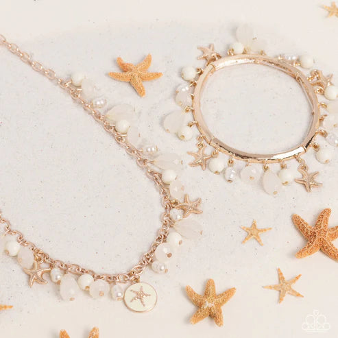 Glassy ivory beads in various shapes, opaque ivory beads, dainty baroque pearls, and gold starfish charms elegantly drip along a classic gold chain across the chest. A textured gold starfish embossed in an ivory-painted gold disc finishes off the design, creating a beach-clustered display. Features an adjustable clasp closure.