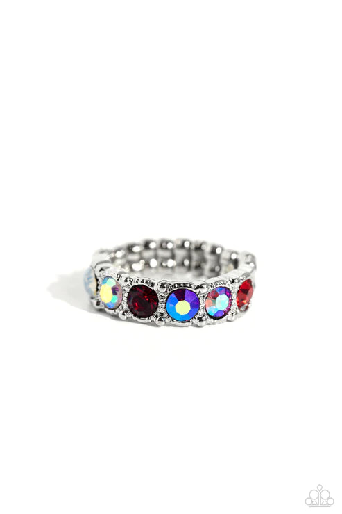 A glitzy collection of iridescent, red, and opal rhinestones encrusts the front of a studded silver band, result in a sparkly spectrum of color across the finger. Features a dainty stretchy band for a flexible fit.