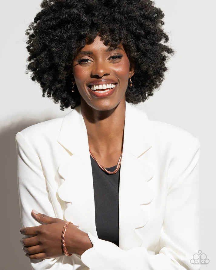 Two sleek strands of high-sheen shiny copper snake chains layer below the neckline, slightly merging through a delicate twist for a touch of visual interest. Features an adjustable clasp closure. Sold as one individual necklace. Includes one pair of matching earrings.