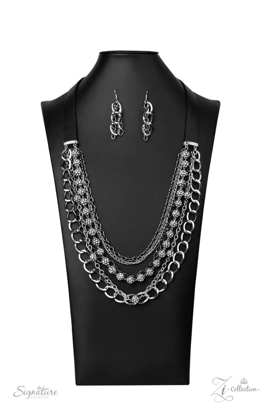 Attached to two strips of black leather, strands of bedazzled white rhinestone encrusted silver beads drape between an exaggerated display of mismatched silver and gunmetal chains down the chest. With its edgy sparkle, grunge meets glamour in this heart-stopping statement-maker. Features an adjustable clasp closure.
