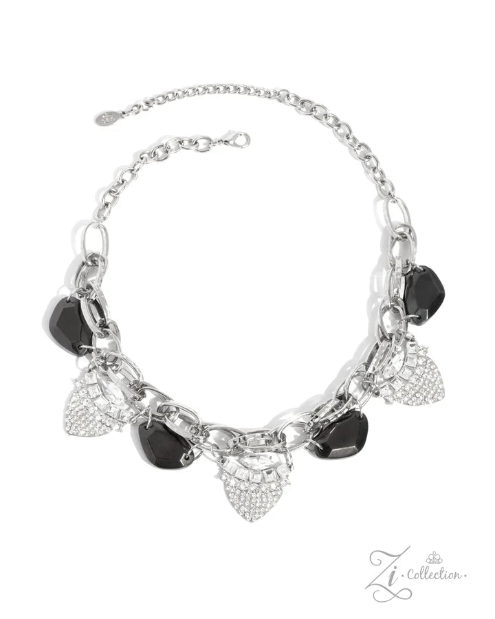 Anchored from a bold silver chain, hammered and sleek abstract silver chained links layer and interconnect along the collar for a mischievously mismatched look. Three frames with a solitaire marquise-cut white gem tilted on its side, give way to a spade-like pendant filled with countless white rhinestones that emerge from a bowing row of glassy, square-cut gems. Defaced stones with a bold hematite finish alternate between the glittery spades, completing the look with a gritty, grungy flourish. Features an adjustable clasp closure.