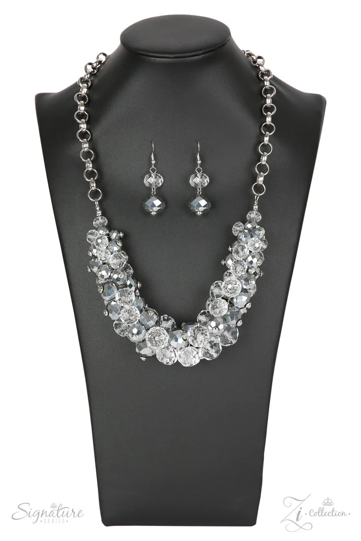 Sparkling crystal-like beading boldly collides with metallic beads featuring light-catching faceted edges to create a gorgeous pendant that falls just below the collar. The beads gradually increase in size towards the center of the design, coalescing into a blinding mix of glitz and unapologetic shimmer. Features an adjustable clasp closure. Named after 2018 Rock the Runway winner, Erika V. Sold as one individual necklace. Includes one pair of matching earrings.