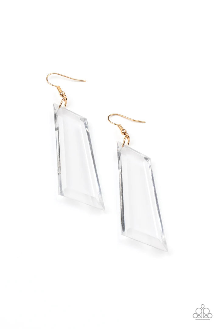 Featuring a flashy emerald-like cut, an asymmetrical crystal-like acrylic frame swings from the ear, casting rainbow reflections with its glassy exterior. Earring attaches to a standard fishhook fitting.